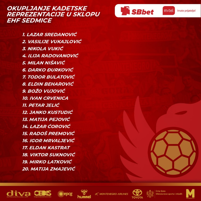 Za ovu akciju pozvani su: golmani Lazar Sredanović, Vasilije Vukajlović, Nikola Vukić, krila Ilija Radovanović, Milan Nišavić, Darko Đurković, Todor Bulatović, Edin Beharović, pivotmeni Božo Vujović, Ivan Crvenica, Petar Jelić, bekovi Janko Kustudić, Matija Pejović, Lazar Ćorović, Radoš Premović, Igor Mrvaljević, Eldan Kastrat, Viktor Suknović, Mirko Latković, Matija Zmajević.